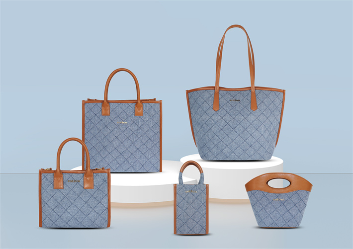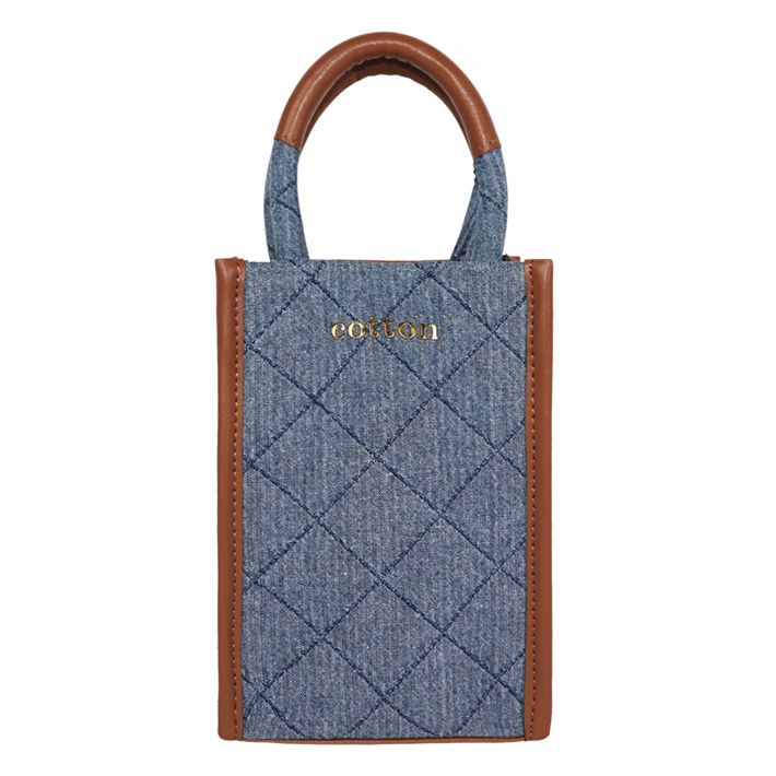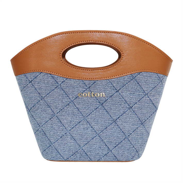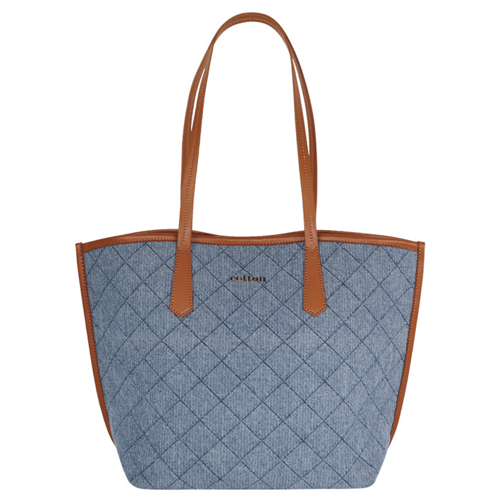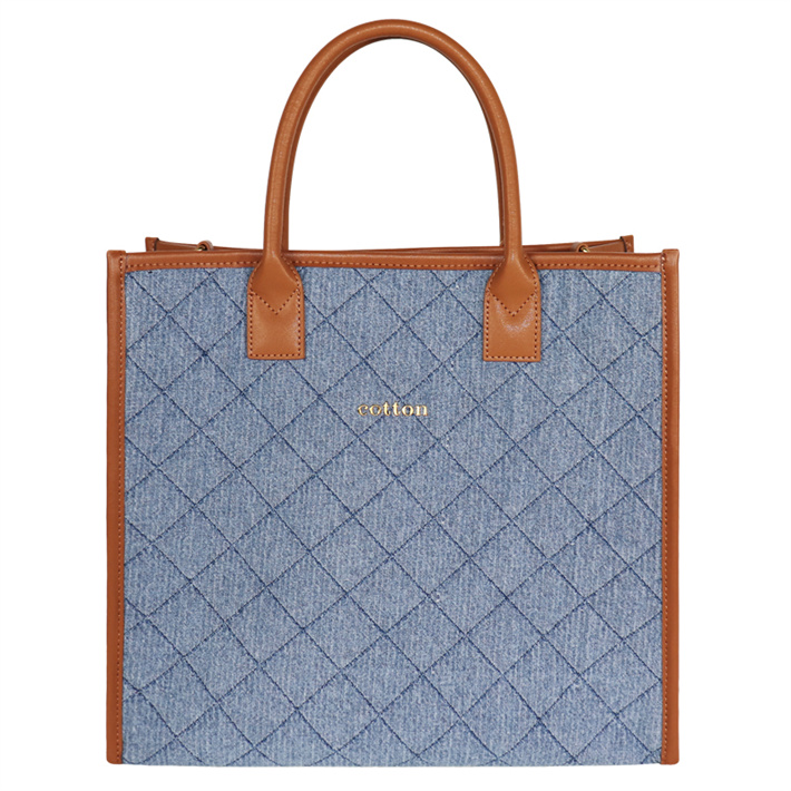日本手提斜挎包定制菱格熱切嘜牛仔色通勤托特包帆布拼皮手背提包