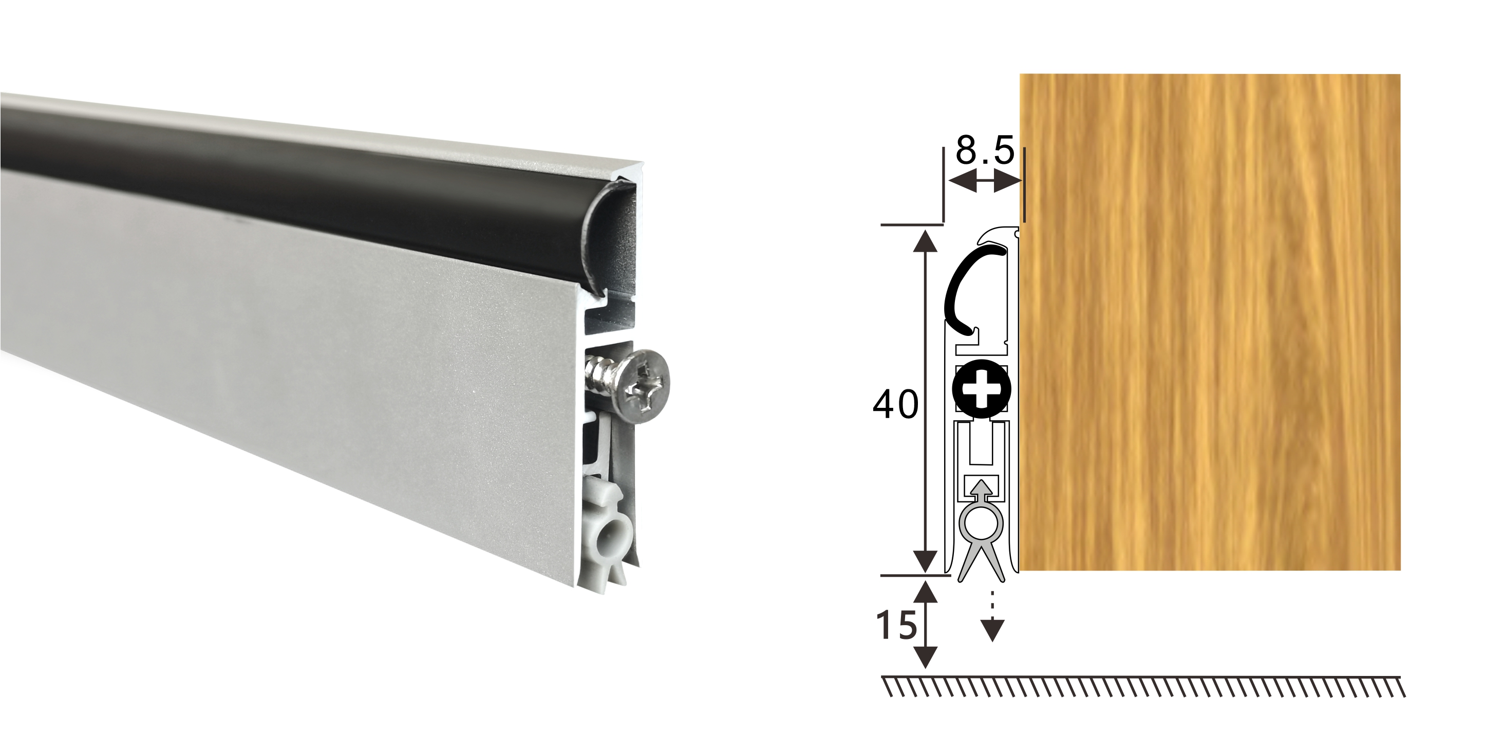 外裝式門底自動升降式密封器,安裝在門底表面,適用于后補工程,如已安裝到位的門需要增加隔音,隔溫,防